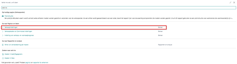 Ga naar (ALT+Q) en zoek op ‘Verkoopinstellingen’.