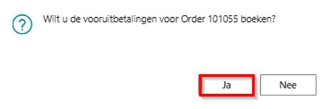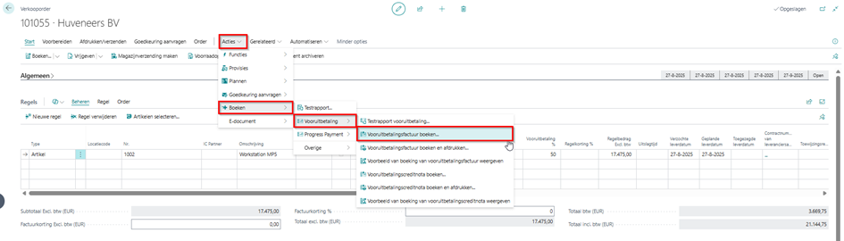 Vanuit de verkooporder maak je de Vooruitbetalingsfactuur door te kiezen voor ‘Acties’ > ‘Boeken’ > ‘Vooruitbetaling’ > ‘Vooruitbetalingsfactuur boeken…’.
