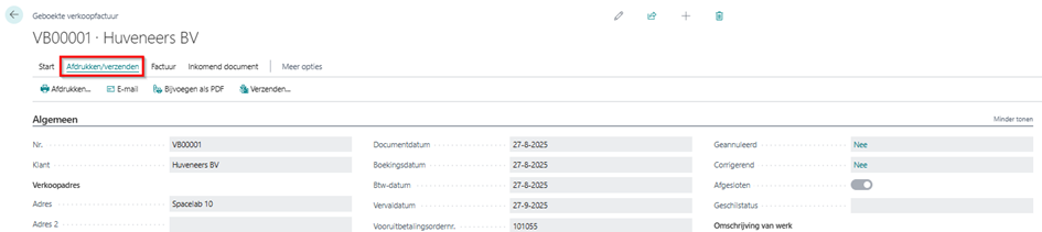 Via ‘Afdrukken/verzenden’ kan je de Vooruitbetalingsfactuur verzenden.