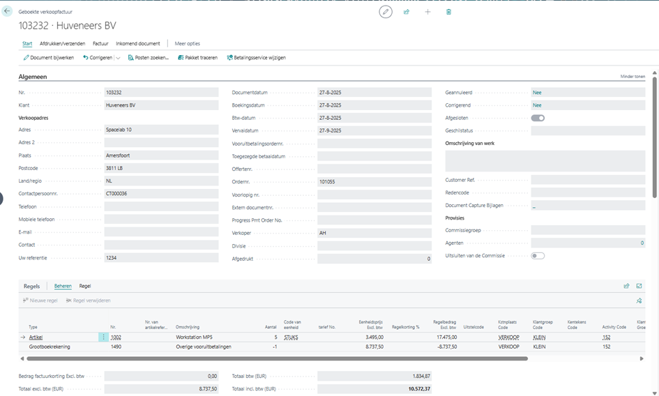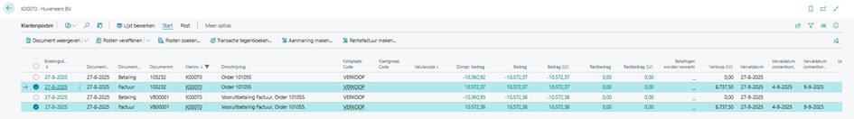 Wanneer de Vooruitbetalingsfactuur wordt betaald door de klant kan je dit net als bij een normale factuur met de Vooruitbetalingsfactuur vereffenen. Wanneer je de definitieve factuur boekt wordt het eerder vooruitbetaalde bedrag automatisch van de nog te betalen factuur afgehaald.