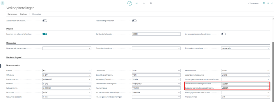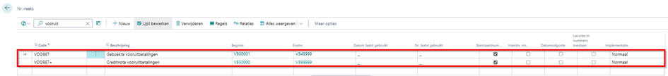 Voor vooruitbetalingsfacturen en -creditnota’s moeten aparte nummerreeksen worden ingesteld.