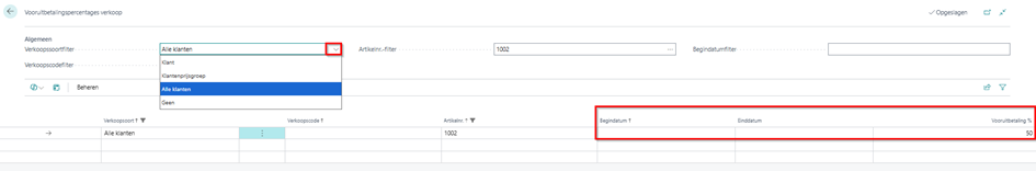 Geef hier aan voor welke klanten dit geldt, eventueel een begin- en einddatum en hoeveel het vooruitbetalingspercentage is.