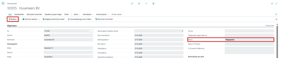 Zodra de klant betaalt, boek je de betaling en kun je de verkooporder ‘Vrijgeven’, en daarna ‘Boeken’.