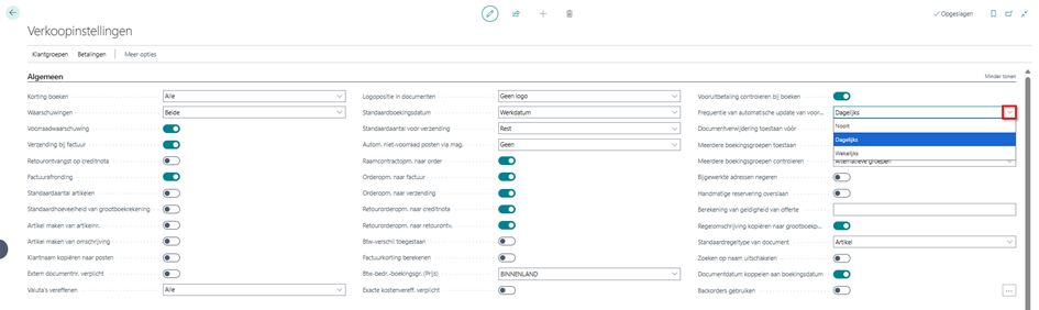 Maak een verkooporder voor een klant of artikel waarvoor een vooruitbetaling vereist is. Het ingestelde percentage wordt automatisch overgenomen. Op de verkooporderregel is dit nog wel handmatig aan te passen.