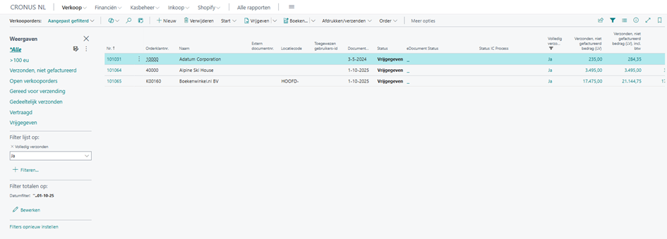 Zet een filter op de kolom ‘volledig verzonden’ met de filterwaarde ‘Ja’, nu zie je alleen verkooporders die volledig zijn verzonden en klaar zijn om gefactureerd te worden.