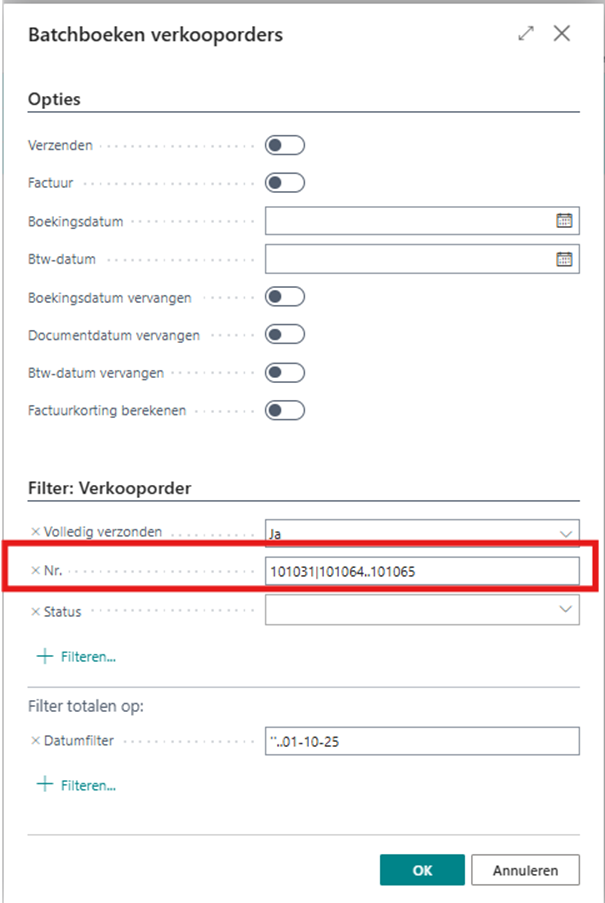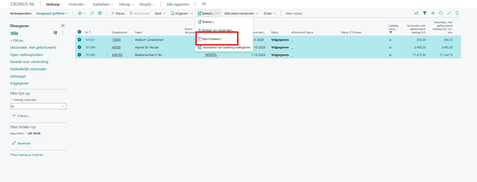 Zoals je in het onderstaande printscreen kunt zien is de selectie van verkooporders omgezet in een filter op de verkooporders. Ook staat er een filter op het veld ‘volledige gefactureerd’.